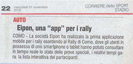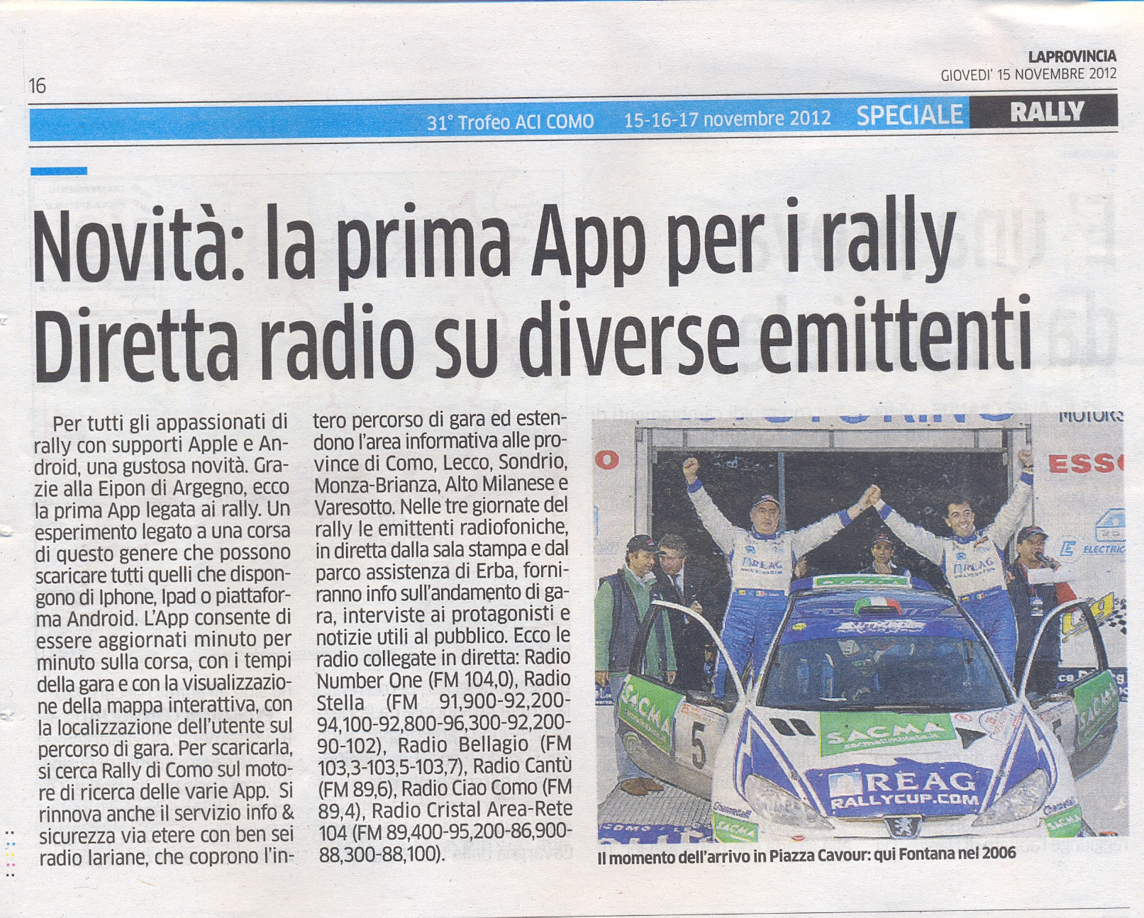 ...Avete già scaricato gratis l’App ” RallydiComo”, applicazione per smartphone e tablet (sia Apple sia Android) che permette di seguire in diretta il rally? Da ogni luogo del mondo, ogni fase saliente dell’evento: dalle verifiche di Como ai tempi nelle prove speciali, ecc. Tutto ciò grazie allo staff dei tecnici Eipon.it.
